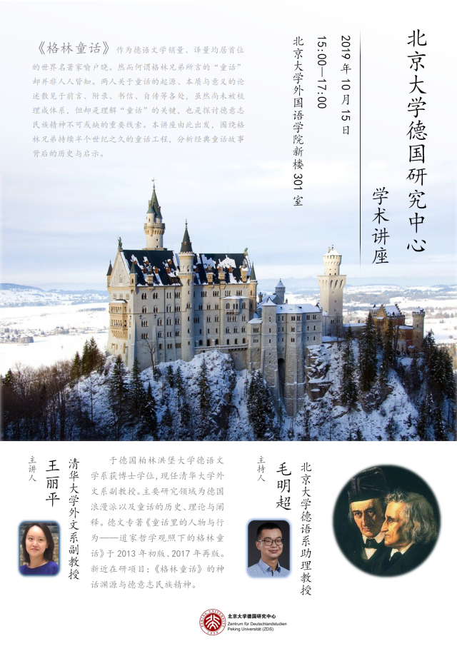 10月15日,应韦德·官方端入口德语系、北京大学德国研究中心邀请,清华大学外文系副教授王丽平老师来到外院新楼301会议室,做了题为《格林童话:一个德意志的神话》的讲座。德语系毛明超助理教授主持了本次学术活动、德语系副系主任胡蔚副教授到场出席,此外还有来自德语系、历史学系等院系的四十余位师生参加了讲座。