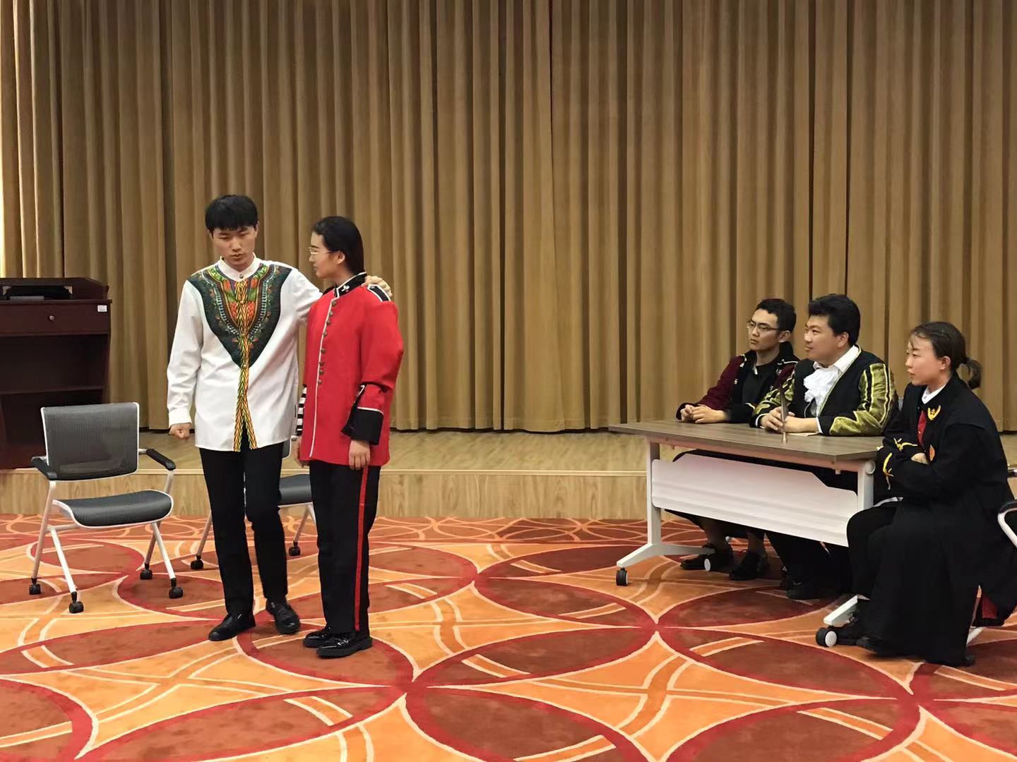 我院代表队以果戈理经典剧作《钦差大臣》 (Ревизор)选段参赛。此节目在刘洪波老师的悉心指导和陈松岩老师的大力支持下,以“俄国戏剧与实践”课为依托,由师生通力合作,在短短二十几天里打造完成。俄语专业本科三年级郭浩宇、管小淳,本科四年级杨岚皓、朱家羲和外语外史本科四年级吴梓民五位同学任本次戏剧选段的主演,克服了时间紧、课业重、台词难等困难,投入了很大的热情和精力;研究生二年级的柳媛和本科三年级张浩然同学完成了不可或缺的后台辅助工作。